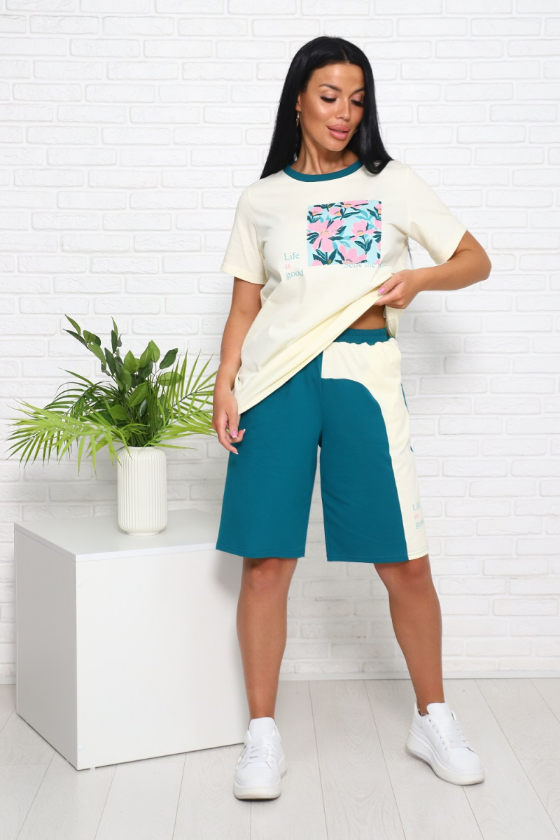 Костюм женский летней тематики: футболка с принтом, свободного кроя, шорты-бермуды оригинального кроя, с принтом а левой штанине, с боковыми удобными карманами и комфортным поясом.
